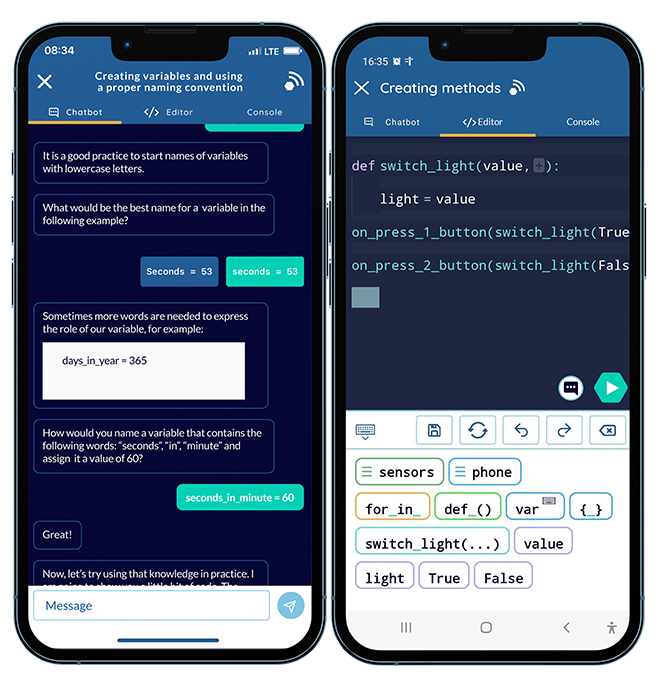 Other apps won’t let you test your code on physical hardware. Sensors allow you to translate initially difficult, abstract concepts into the real world. Additionaly, development paths in other applications are predetermined. At CodeAll, our owl can advise you and supplement the knowledge you need through chatting in a chatbot module.
